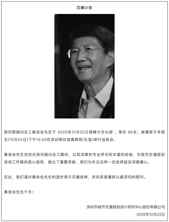 10月23日晚间,深城交发布讣告,公司原顾问总工黄良会于2025年10月20日傍晚去世,享年85岁。深城交在讣告中表示,“黄良会先生在担任我司顾问总工期间,以其深厚的专业学识和丰富的经验,为我司交通规划咨询工作提供悉心指导,做出了重要贡献,我们为失去这样一位良师益友深感痛心。”